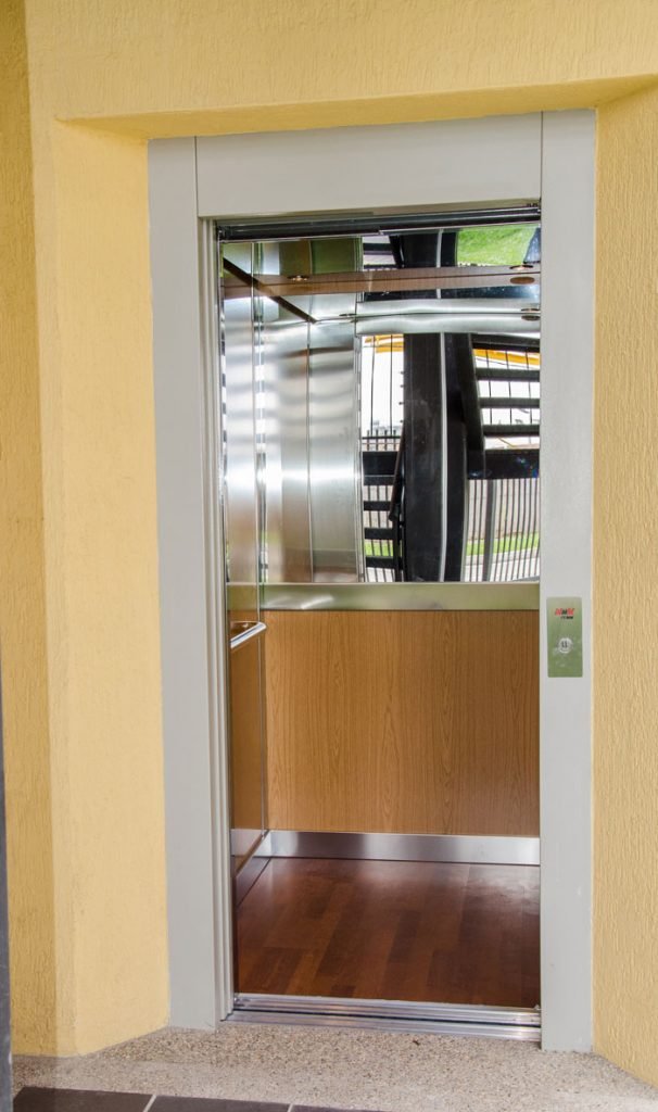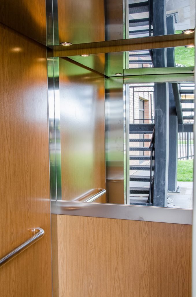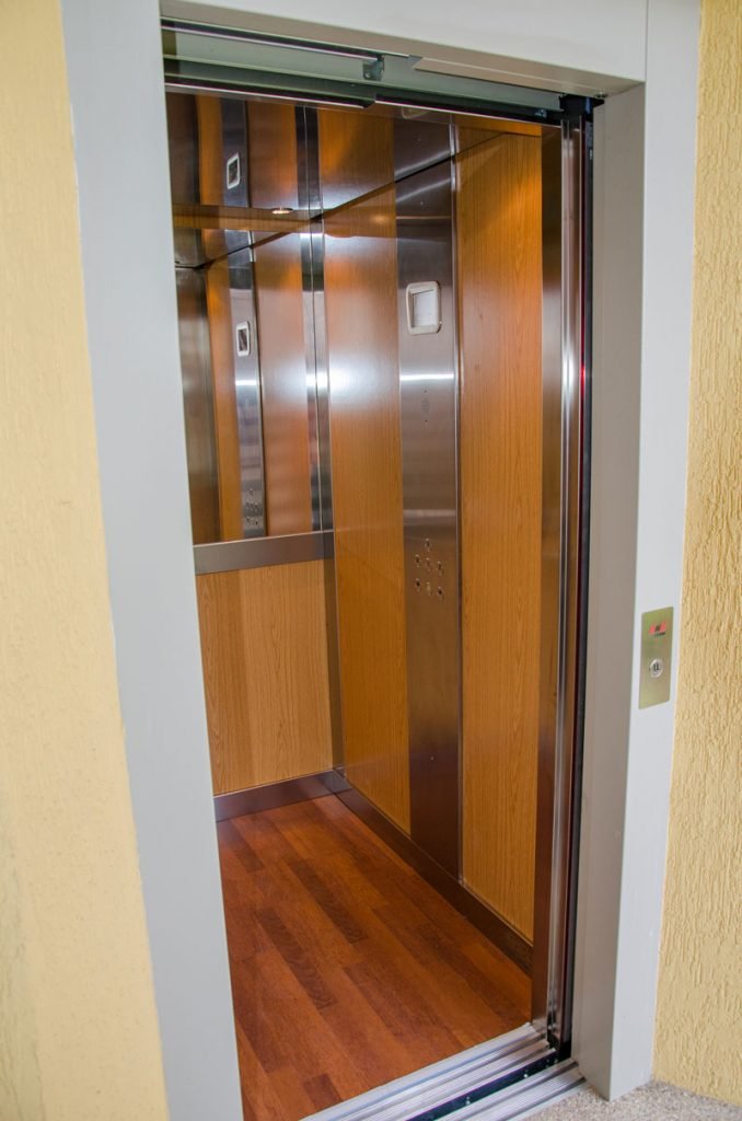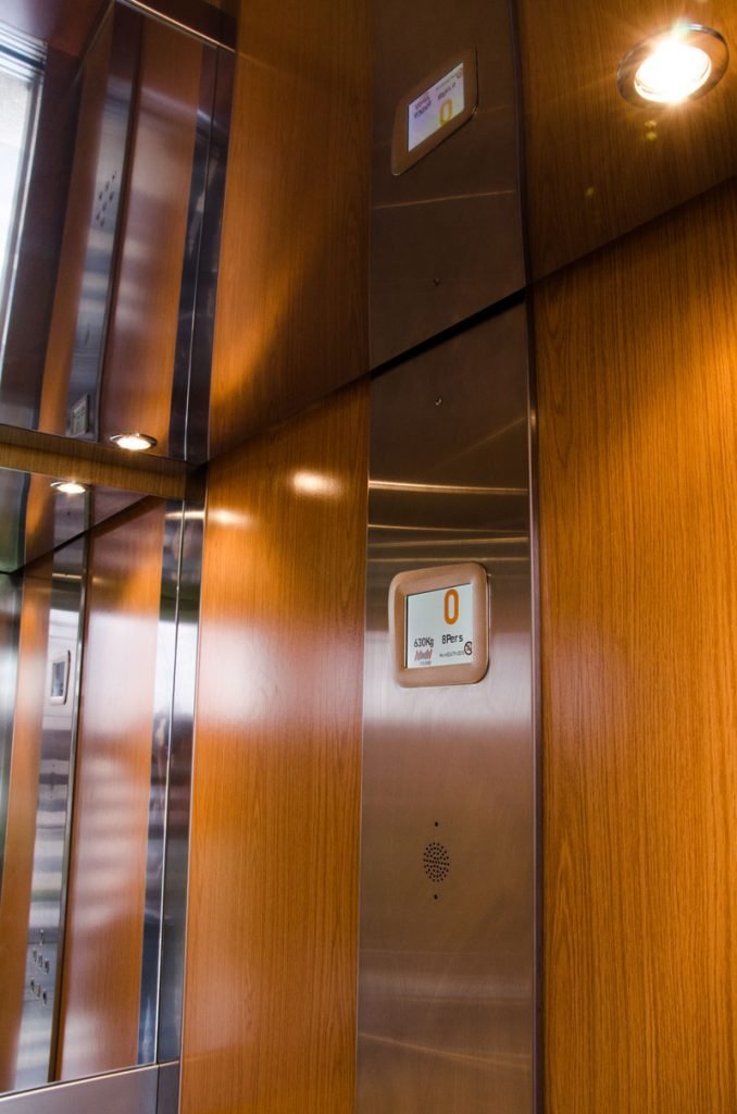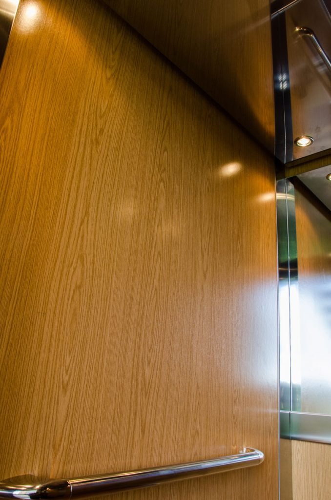 El piso del ascensor armoniza con sus paredes al tener un terminado en madera.