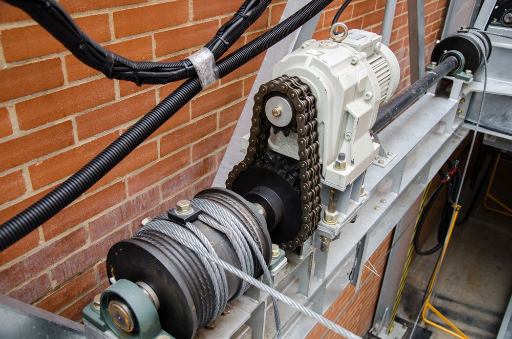 - Dispositivo de tensión y protección del cable que detiene la plataforma al detectar debilidad.