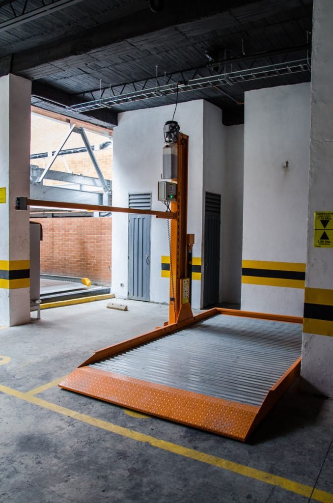 En el área de parqueaderos de residentes se instalaron un conjunto de equipos estándar que cuentan con una capacidad de carga de 2700 Kg con un motor hidráulico independiente que permite la manipulación simultánea de los equipos. Cada uno cuenta con una botonera independiente y llave personalizada para permitir que solo un usuario lo ponga en funcionamiento.